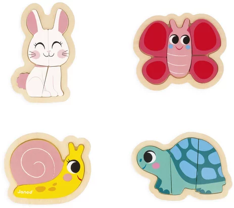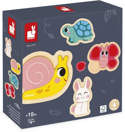 Tout d’abord, ce coffret de 4 puzzles évolutifs plonge l’enfant dans l’univers doux et coloré des animaux du jardin. Présenté dans une jolie boîte cadeau, il invite à découvrir escargot, tortue, lapin et papillon tout en favorisant l’éveil et l’apprentissage dès le plus jeune âge.
