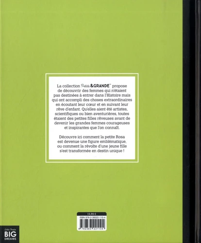 De plus, ce livre fait partie de la collection « Petite & GRANDE », qui met en lumière des femmes qui n’étaient pas destinées à entrer dans l’Histoire. Pourtant, en écoutant leur cœur et en suivant leur rêve d’enfant, elles ont accompli des choses extraordinaires.