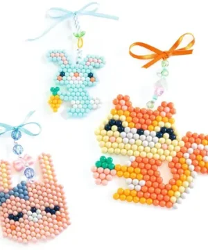 Par ailleurs, le coffret inclut 2 plaques de travail, ce qui permet d’alterner facilement les créations. De plus, grâce aux rubans et pendentifs fournis, l’enfant peut transformer ses animaux en porte-bonheur à accrocher partout.