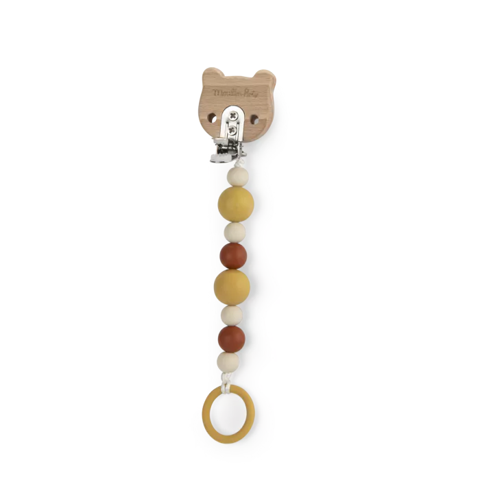 Cette attache-tétine Moulin Roty en bois et silicone, motif tigre, garde la sucette de bébé à portée de main dès la naissance. Sûre, ludique et pratique, elle peut être accrochée partout grâce à son clip ajustable.