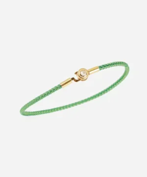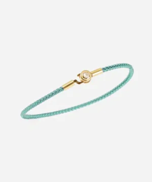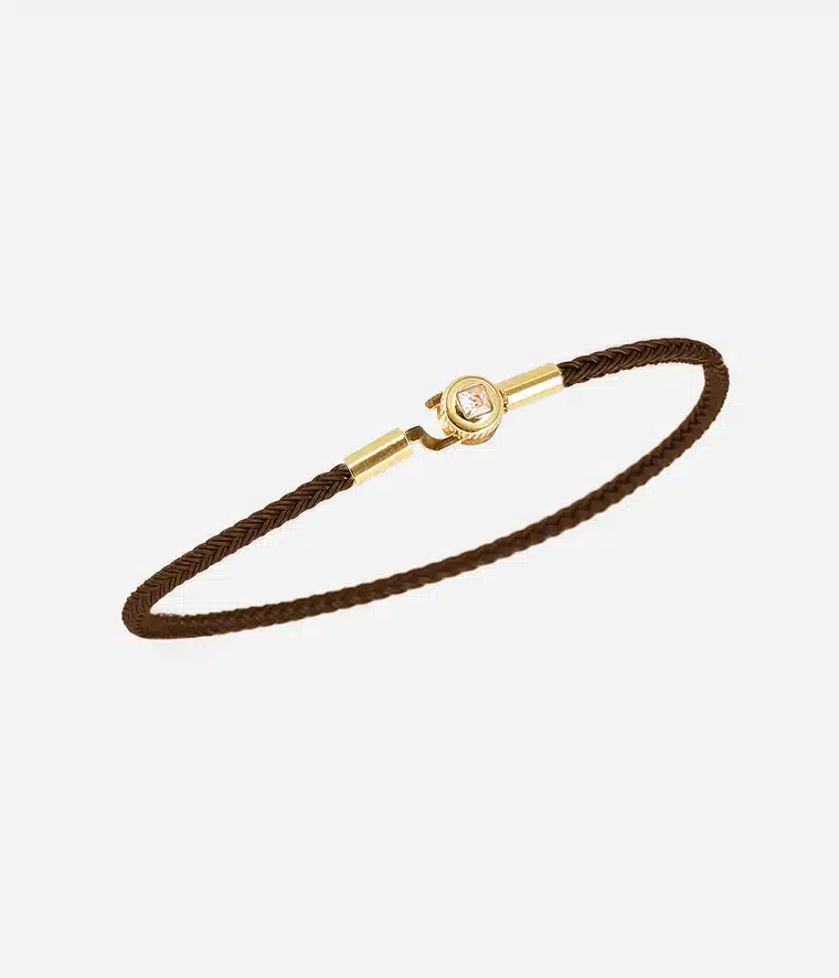 Bracelet cordon de couleur serti d’une attache en acier sur laquelle se trouve un zirconium. L’attache est un petit crochet qui vient s’enfiler à l’intérieur de l’empiècement en acier.