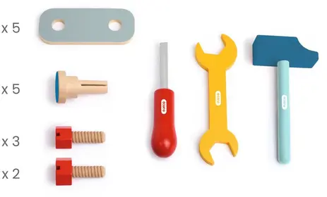 Chaque outil est parfaitement dimensionné pour les petites mains, ce qui facilite leur prise en main. De plus, cette adaptation permet à l’enfant de manipuler les accessoires facilement et en toute confiance. Ainsi, le jeu reste agréable et accessible, même pour les plus jeunes bricoleurs.