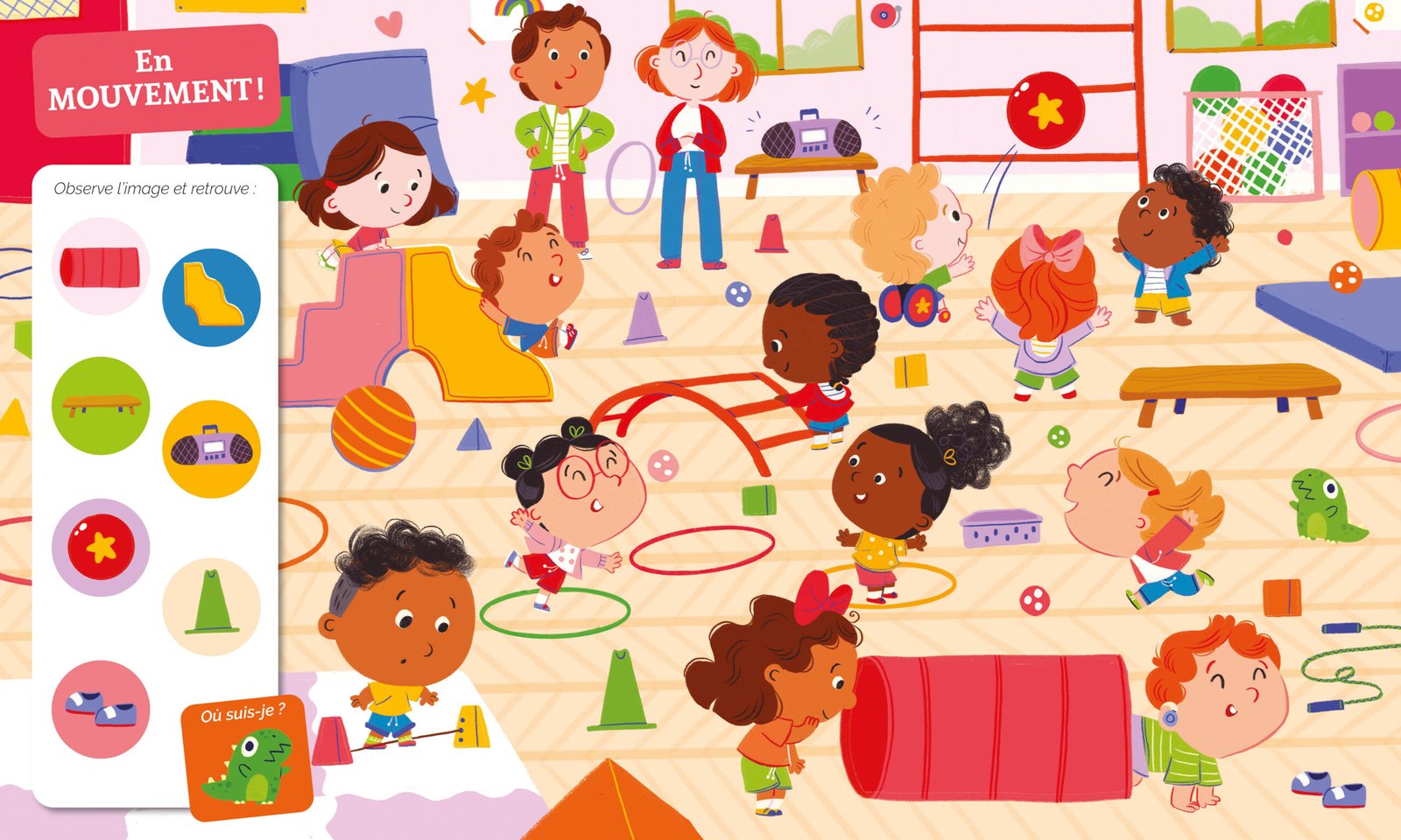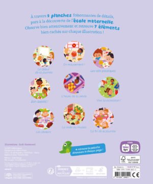 Sur chaque planche, il doit retrouver 7 éléments cachés ainsi que la mascotte. Ainsi, il développe son sens de l’observation, sa concentration et son vocabulaire tout en s’amusant.