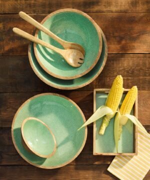 Légère et élégante, la coupe BRUSH GREEN séduit autant par la beauté naturelle du bois que par son décor vert moderne. En effet, la teinte chaleureuse du manguier contraste harmonieusement avec la finition colorée, ce qui lui confère un style à la fois authentique et contemporain.