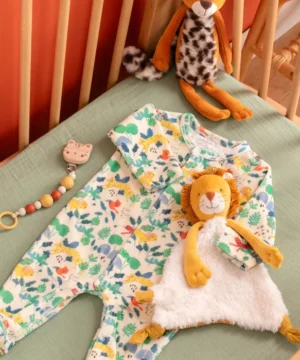 Ce doudou Mamba le lion Moulin Roty La forêt Mawa, doux et rassurant, accompagne bébé dès la naissance. Avec son attache-tétine intégré, il allie confort et praticité pour des nuits paisibles.