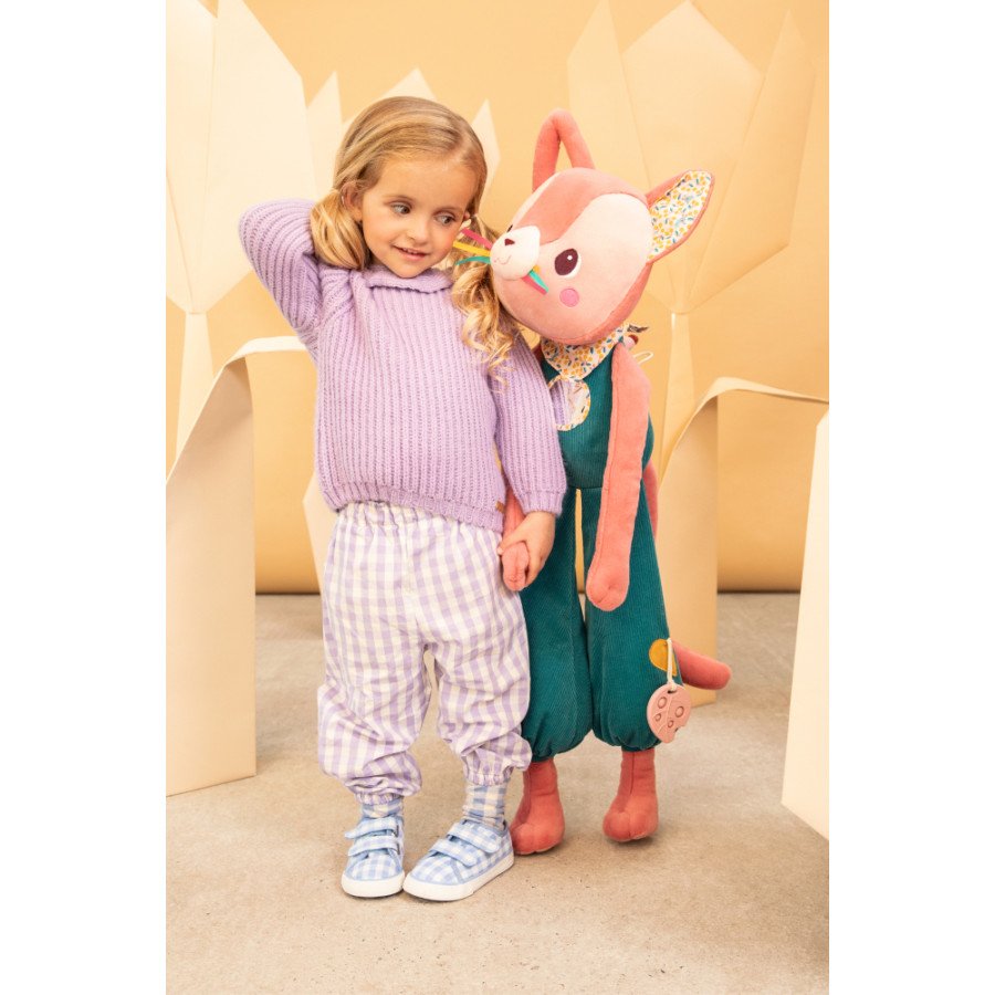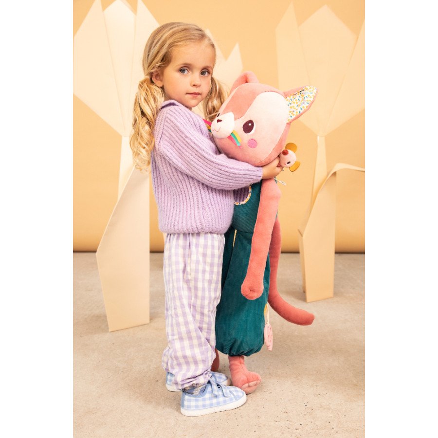 Toujours accompagnée de ses souris malicieuses, le Grand Chat Découvertes Jeanne invite votre enfant dans un univers doux et poétique. Avec ses longues jambes, son bandana coloré, ses moustaches rigolotes et son pantalon baggy, elle a tout d’une copine cool à adopter sans hésiter. Sa poignée en guise d’oreille permet de l’emporter facilement partout.