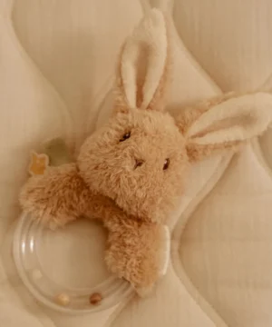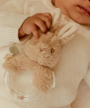 La forme ergonomique de l’anneau et la texture douce du lapin permettent à bébé de saisir et tenir facilement son hochet. Cette manipulation favorise la coordination main-œil et l’éveil sensoriel, tout en offrant des moments de jeu interactif et amusant.