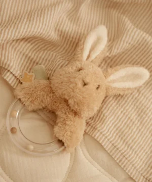 Le Hochet Anneau Lapin de la collection Newborn Naturals est conçu pour devenir le compagnon préféré de votre tout-petit. Avec son lapin en tissu ultra-doux et son anneau en plastique léger, il offre à bébé un jouet sûr, agréable au toucher et facile à manipuler dès les premières semaines.