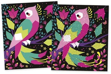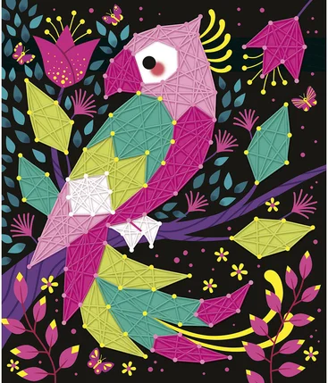 Ensuite, ce coffret permet de réaliser 2 tableaux en fils tendus. Grâce au livret explicatif pas à pas, l’enfant plante les clous fluos dans les tableaux en mousse, puis entrelace les fils colorés pour faire apparaître les motifs. Ainsi, la création prend forme progressivement pour un résultat spectaculaire.