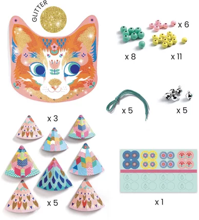L’enfant commence par enfiler les perles, cônes et grelots sur les fils de coton ciré. Ensuite, les fils sont attachés au support fourni pour donner forme au chat. De ce fait, chaque étape est simple et accessible. Lorsque les fils s’agitent, Kitty scintille et produit un doux tintement, rendant la création encore plus magique.