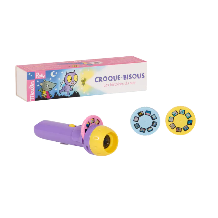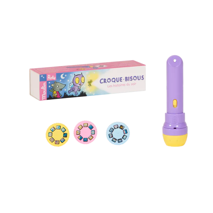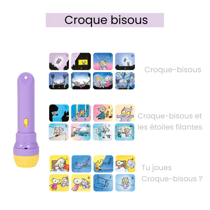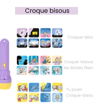 Lampe torche Croque-Bisous avec 3 disques projetant ses aventures. Avec cette veilleuse, les enfants dès 3 ans découvrent des histoires lumineuses qui stimulent leur imagination avant le coucher.