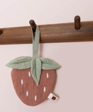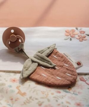 Grâce à son attache par nœud, vous pouvez y accrocher une sucette en un instant. Ainsi, ce petit doudou Fraise devient le compagnon parfait pour les promenades, les siestes ou les moments câlins, tout en évitant à la tétine de se perdre.