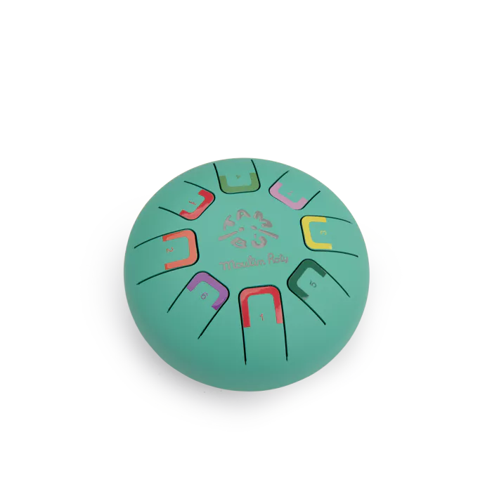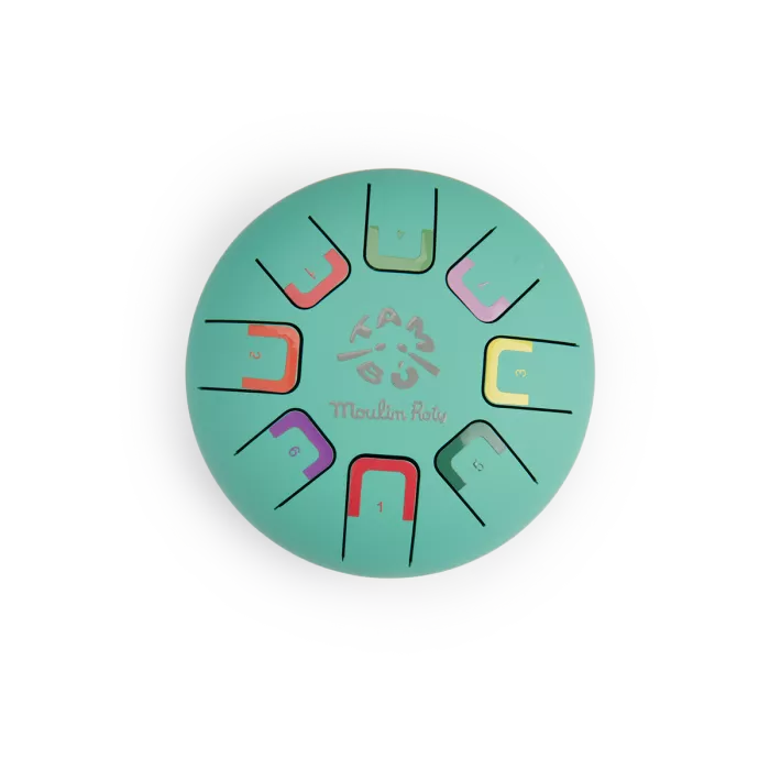 Un tambour à languettes coloré pour jouer avec les sons dès 3 ans. 8 notes à découvrir avec les mains ou les baguettes, dans l’univers exotique de Dans la Jungle.