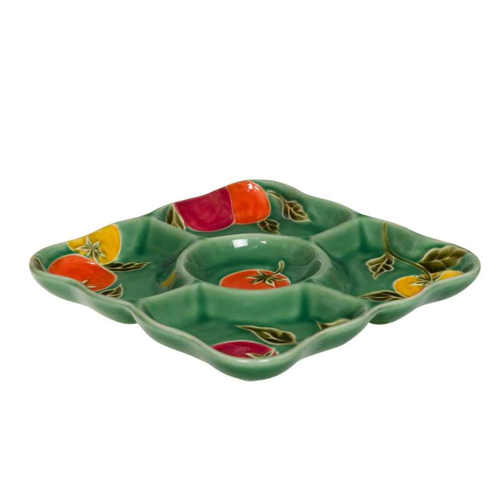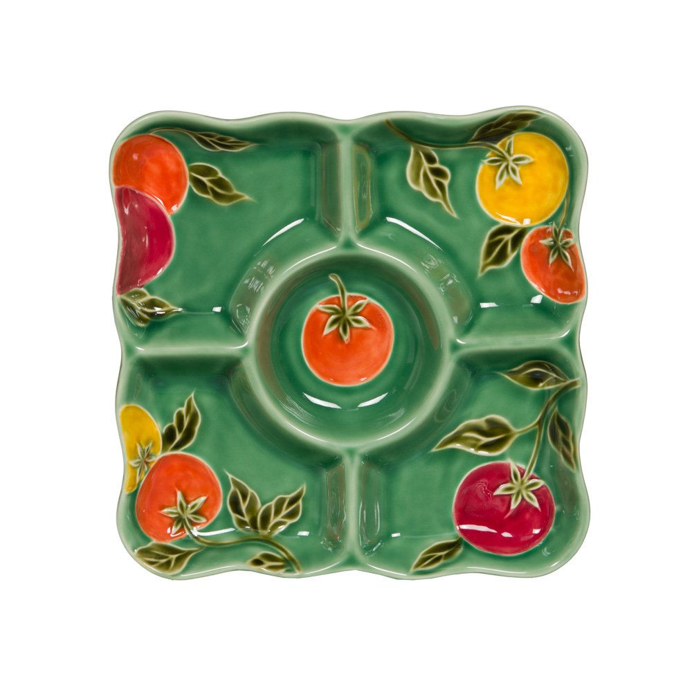 Plat Pomodoro 5 compartiments 🍅 – 23 cm. Motifs colorés et grès solide pour des repas conviviaux et pratiques. En plus, il va au micro-ondes et au lave-vaisselle, parfait pour partager plusieurs plats sans mélanger les saveurs. 🌿