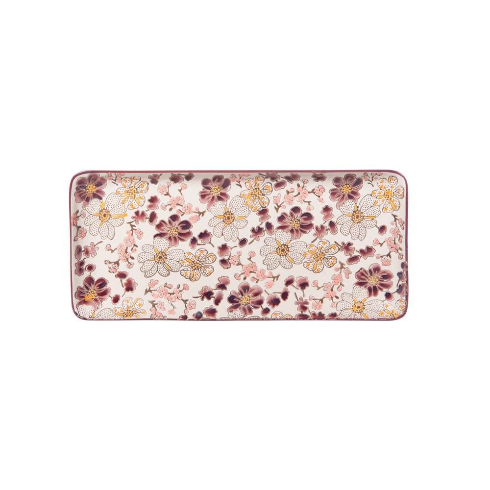 Le plat à cake Kiyo s’inspire de la délicatesse des estampes japonaises pour offrir un design à la fois raffiné et poétique. En effet, son motif associe fleurs stylisées, fines branches et teintes chaleureuses dominées par des nuances rouges, accompagnées de touches de bordeaux, safran, crème et rose poudré.