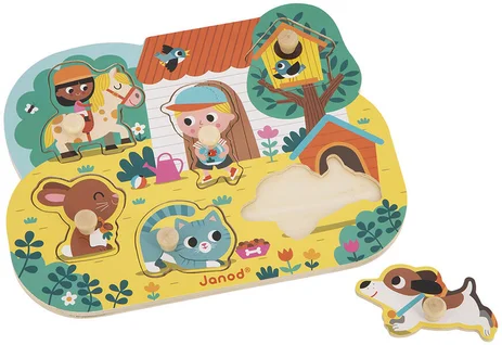 Votre enfant va explorer la vie à la campagne avec le puzzle en bois “La Campagne”. Grâce à ses illustrations colorées et ses pièces en bois découpées, il pourra reconnaître et nommer des animaux tels que le chat, le chien, le cheval avec sa cavalière, le lapin, l’oiseau avec sa maison ou encore le petit garçon avec son poisson rouge.