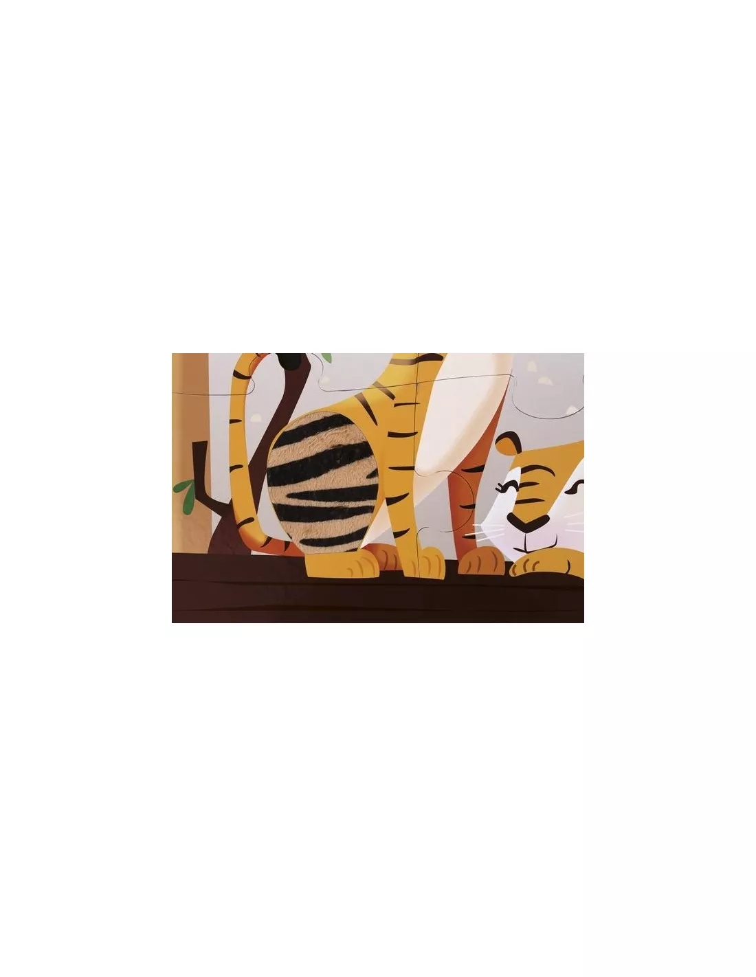Ensuite, ce puzzle géant mesure 65 × 50 cm et comprend 20 pièces en carton rigide, dont 7 pièces tactiles. Ainsi, votre enfant peut caresser la patte du tigre, le ventre de la girafe ou le dos du singe, pour une expérience ludique et sensorielle unique.