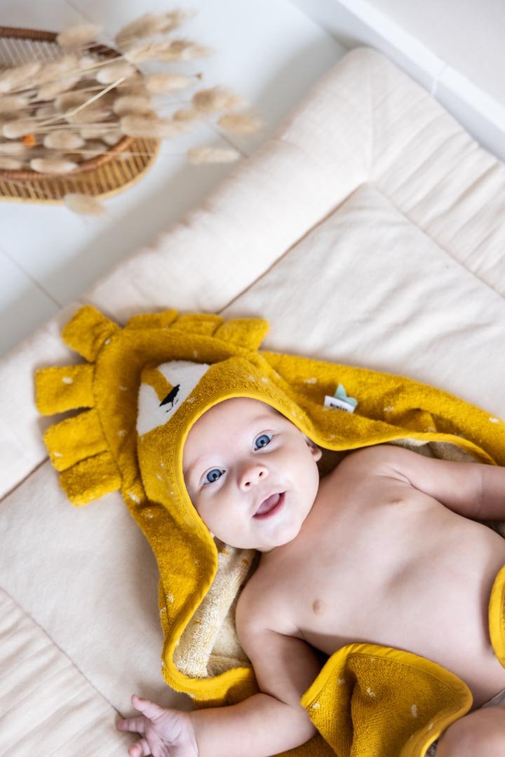 Forme enveloppante, pour maintenir bébé bien au chaud après le bain.